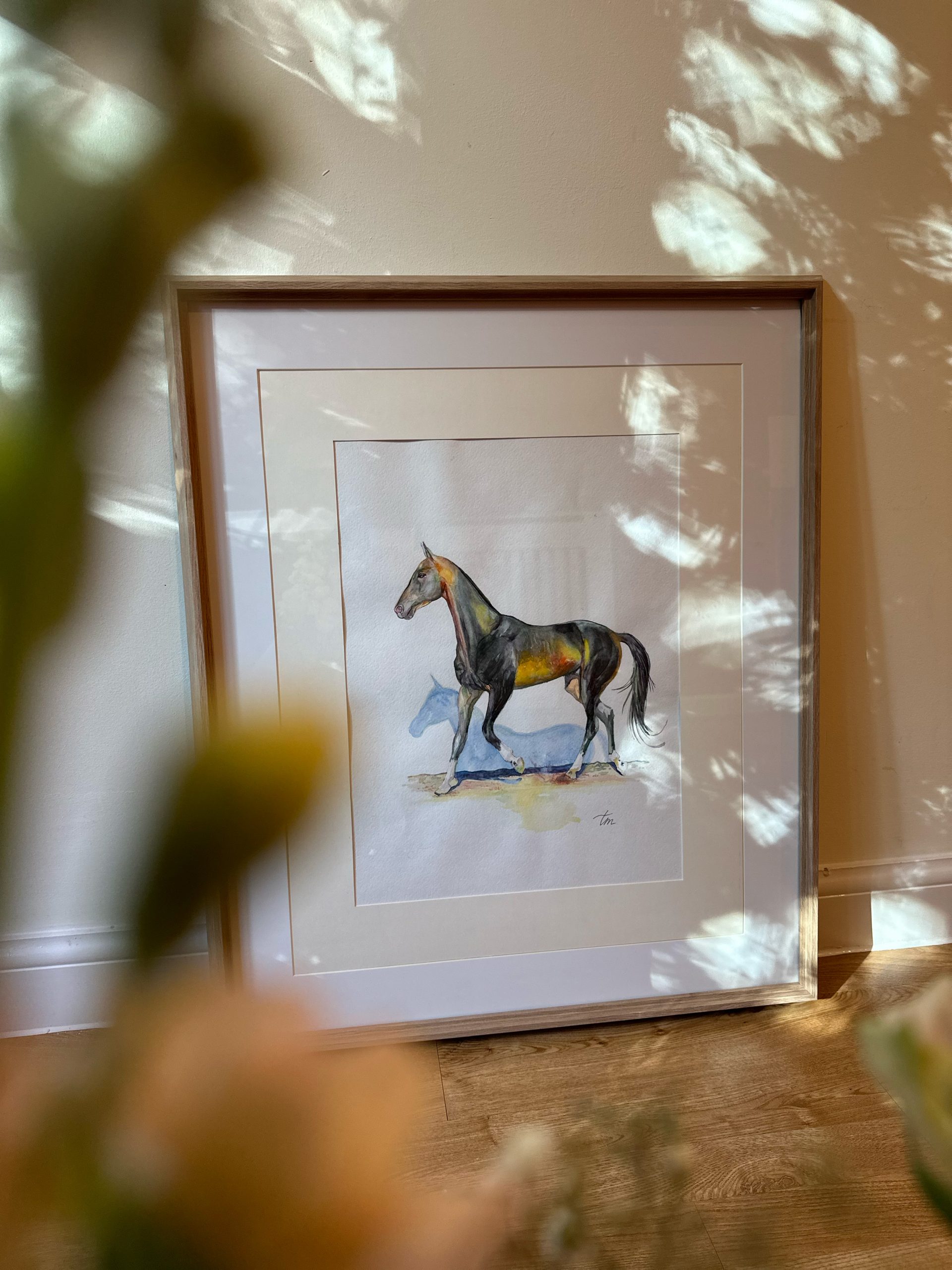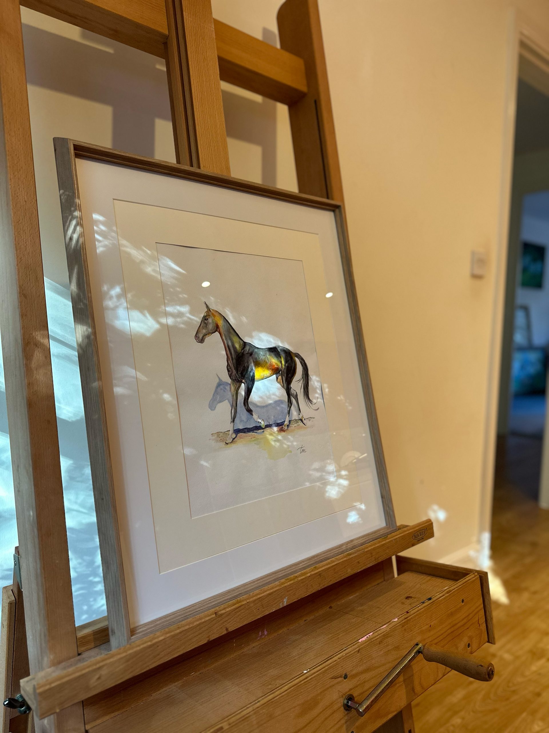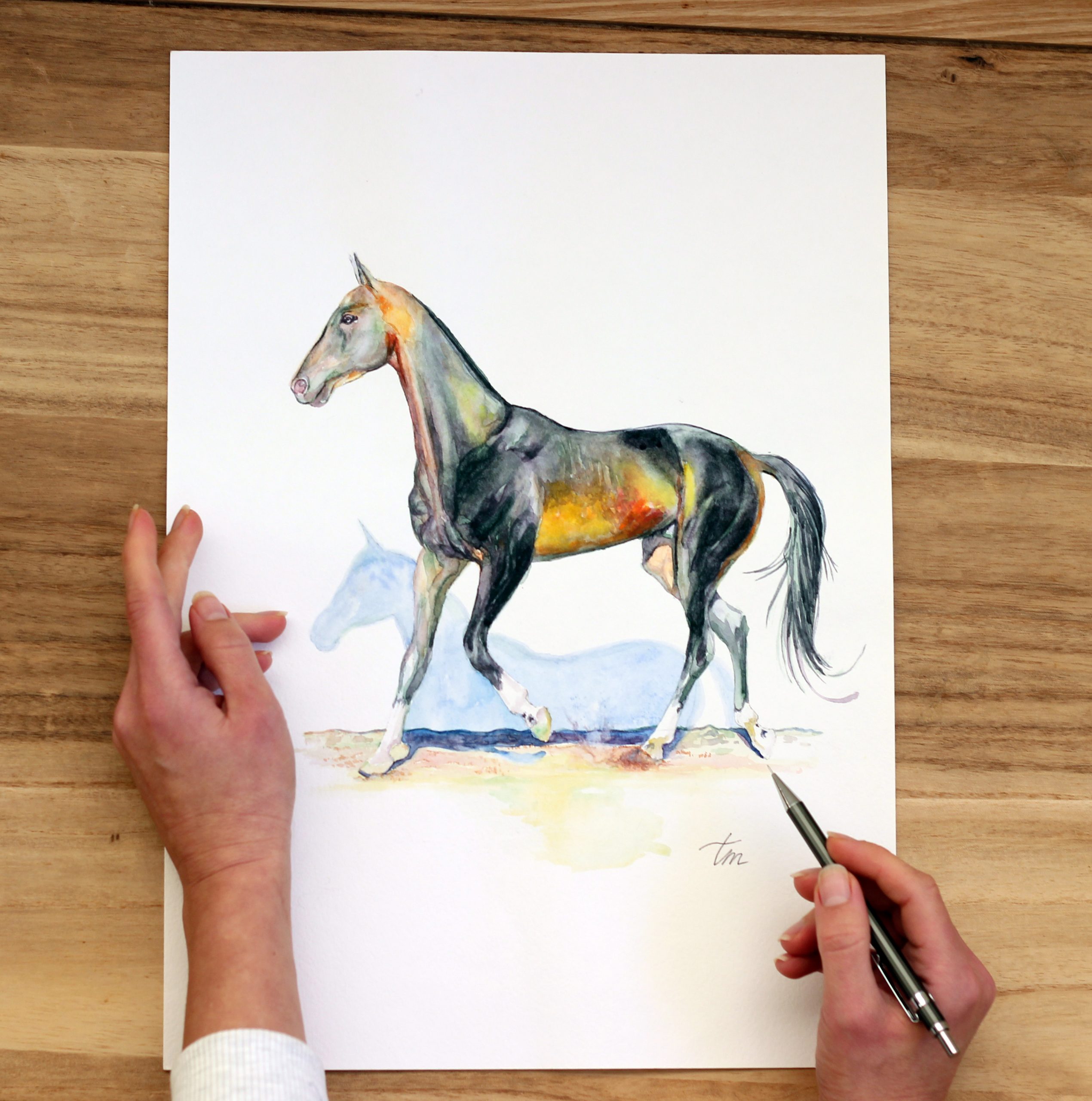 Born from colour and light, a watercolour spirit awakens in motion. A gentle gallop echoes across the blank canvas, the horse running lightly and pulling its shadow through quiet air, its silent companion.