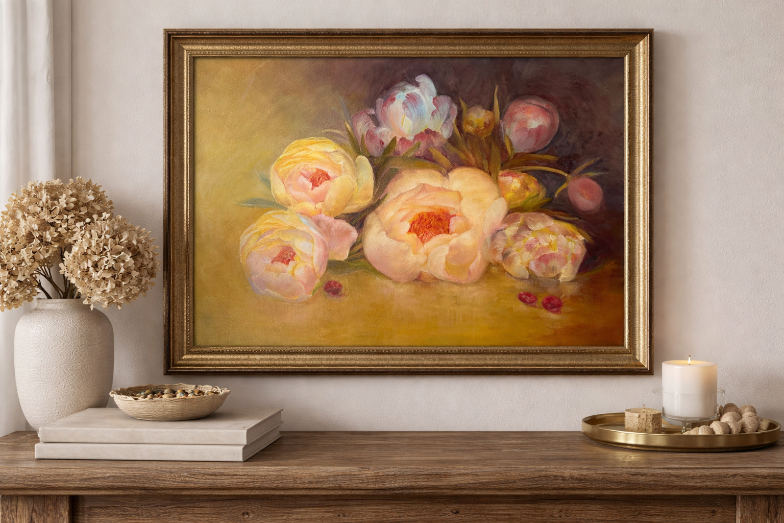 Discover the timeless beauty of Eternal Elegance, a stunning still life oil painting that masterfully captures the vibrant yet delicate allure of peonies in full bloom and the irresistible charm of fresh cherries. With each brushstroke, this artwork immerses the viewer in a symphony of color, texture, and light that feels both luxurious and inviting.