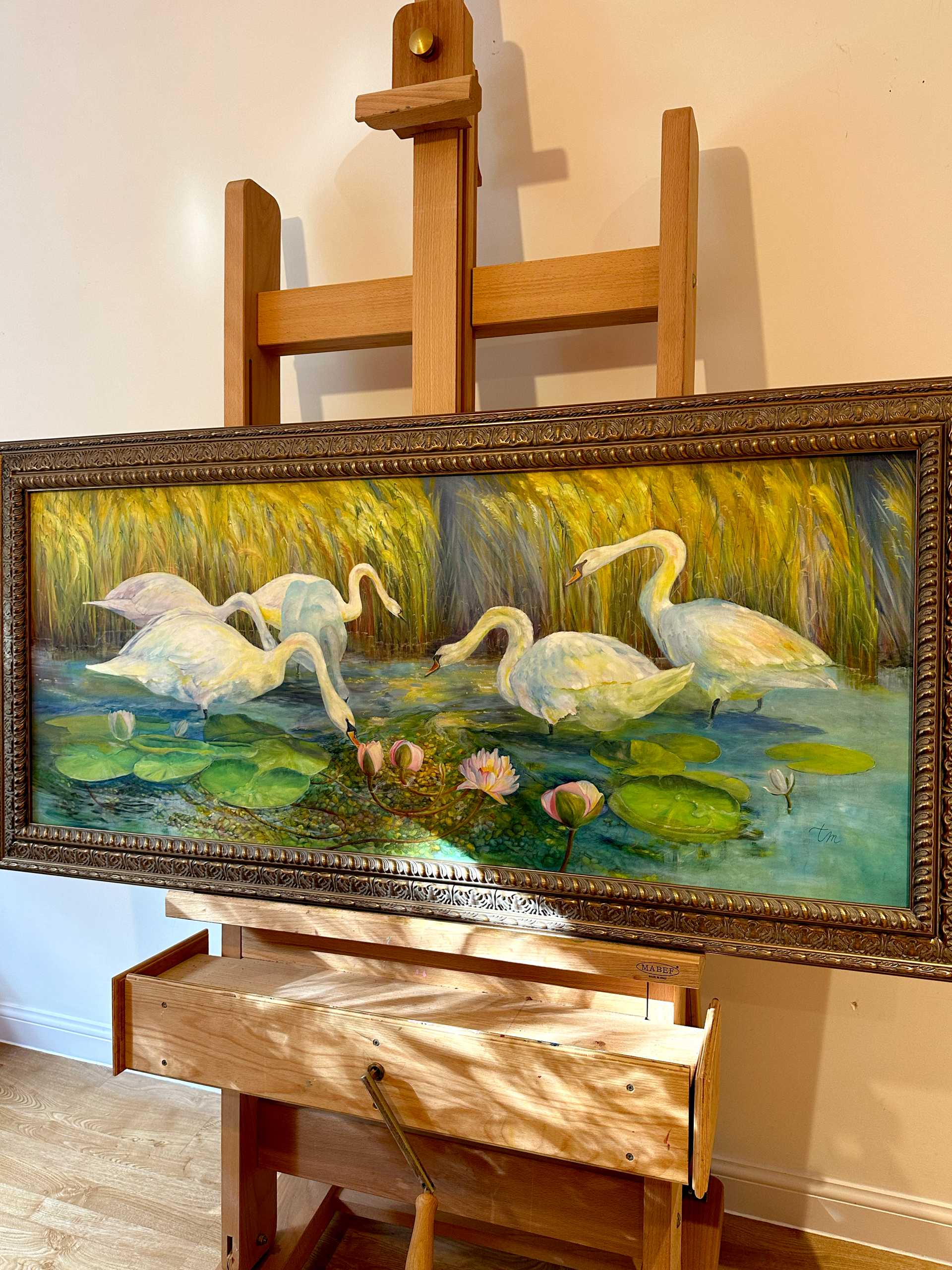 “Grace in Bloom” is an original oil painting on canvas. I chose oil because it allows me to layer colours and textures, creating depth and luminosity that bring the scene to life. Inspired by the unity of family and the lotus flower’s symbolism of light and purity, this painting reflects the brightness that togetherness brings to daily life. Being together is a powerful force, and through this work, I hope viewers feel calm, connected, and reminded of the quiet strength symbolised by the swans, reflecting human connection. It celebrates the elegance of wildlife and the subtle poetry of natural spaces.