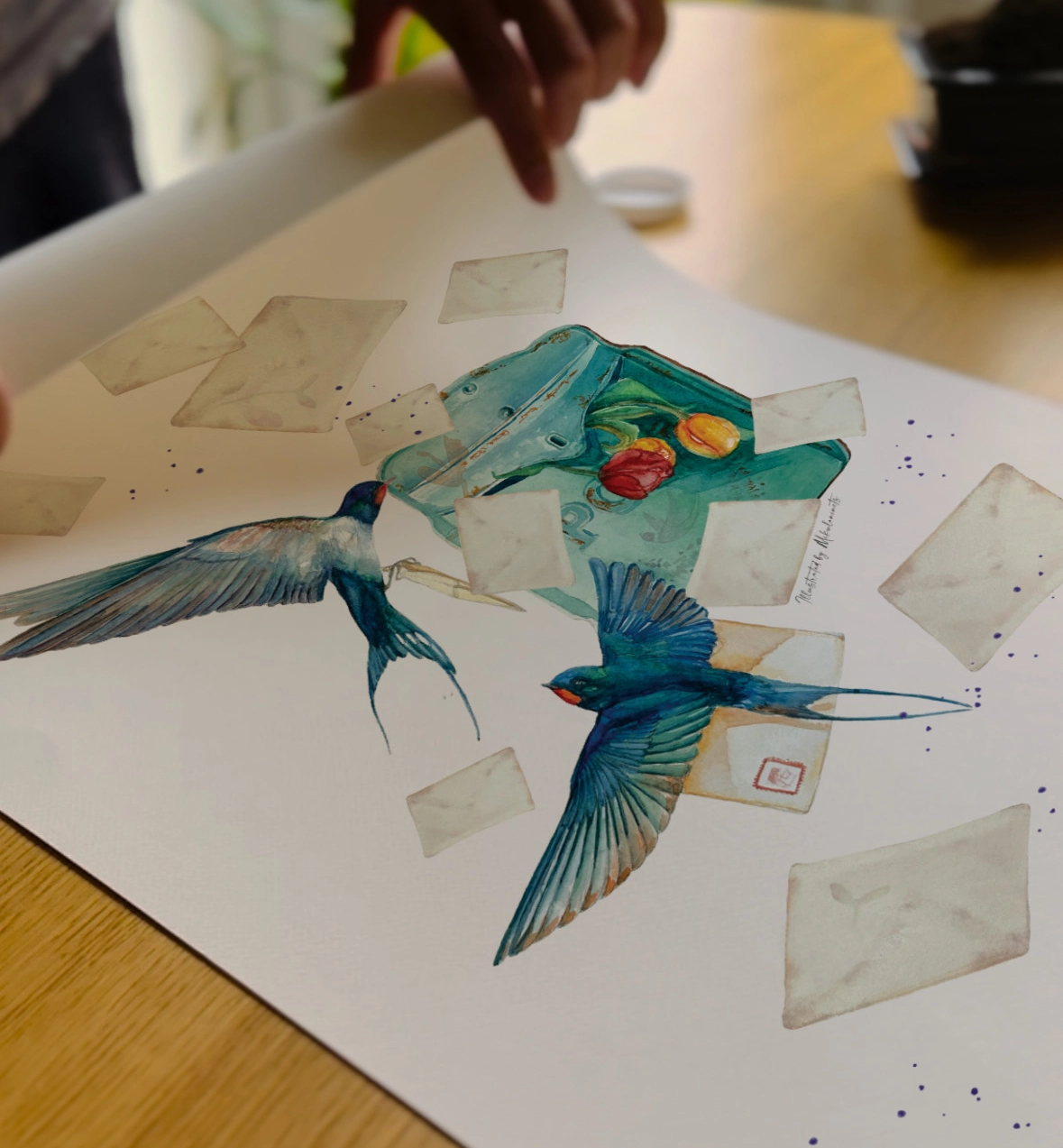 Between sky and paper, tiny wings bring words of love and distant dreams.
