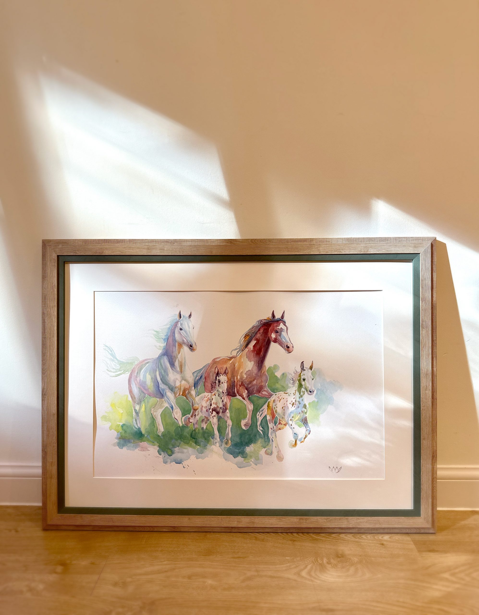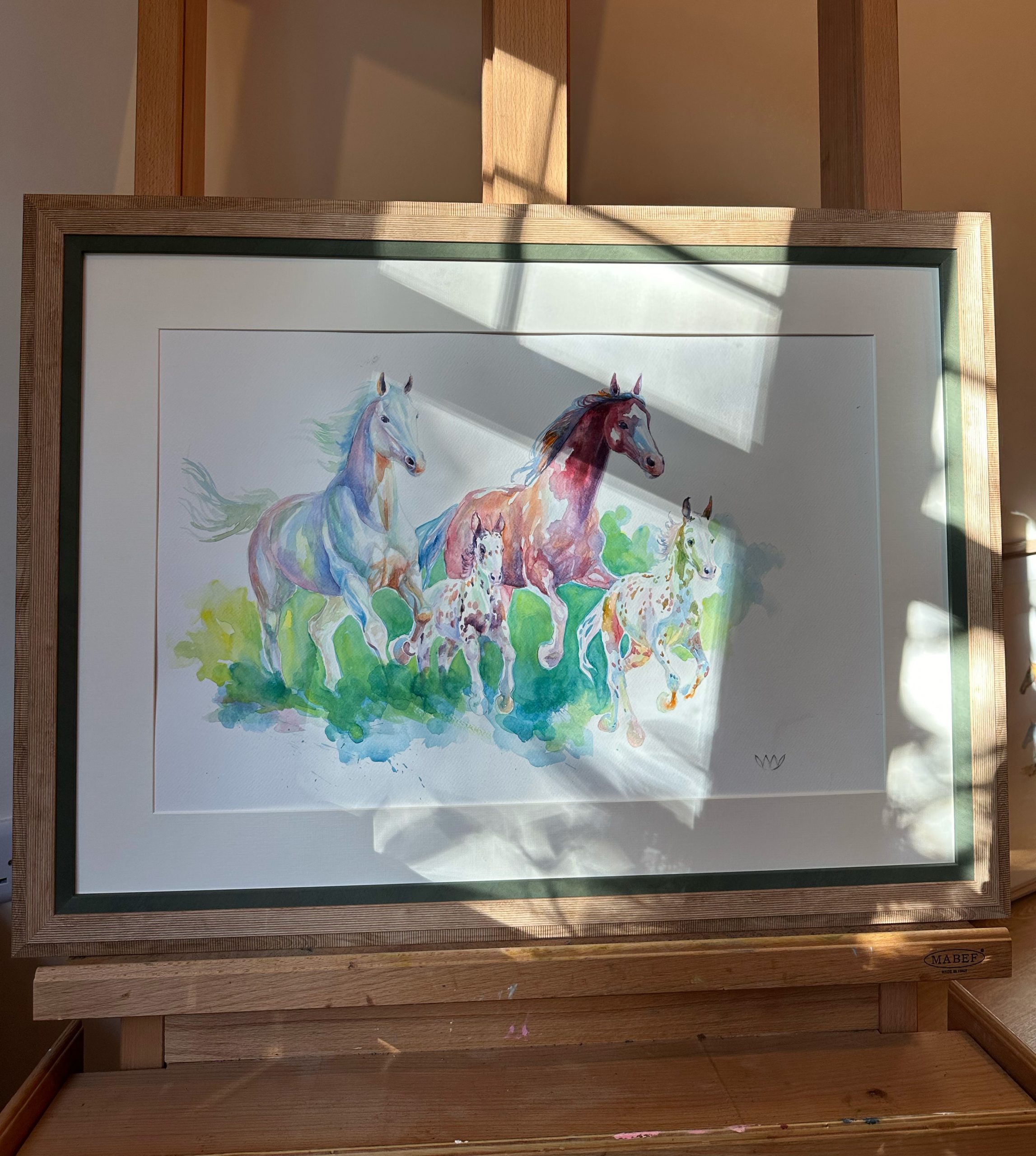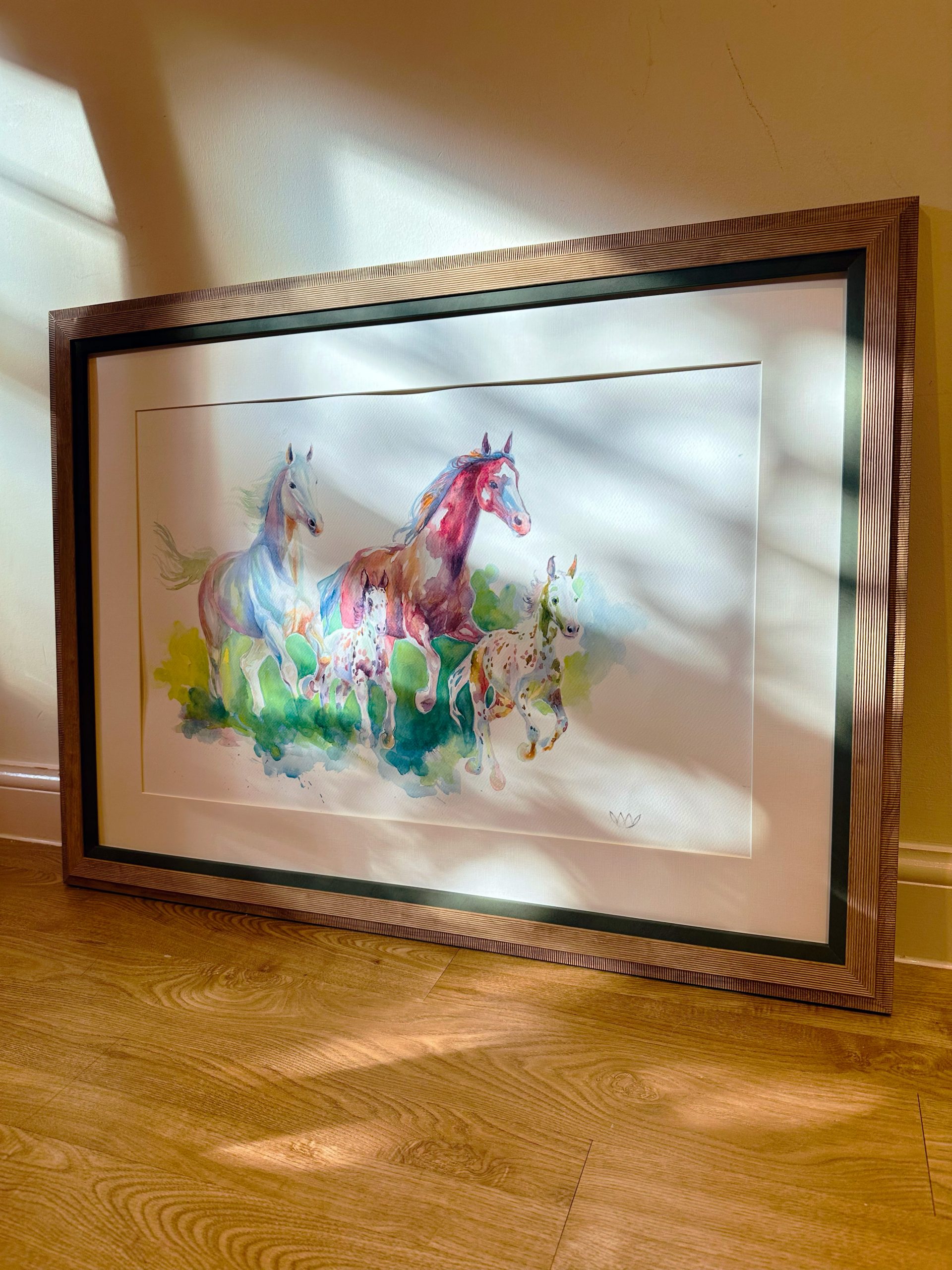 This watercolour herd races forward in a swirl of colour and energy—two playful foals and two graceful adults painted in soft, expressive hues. A beautiful statement piece for any equestrian home, children’s room, or art lover’s collection.