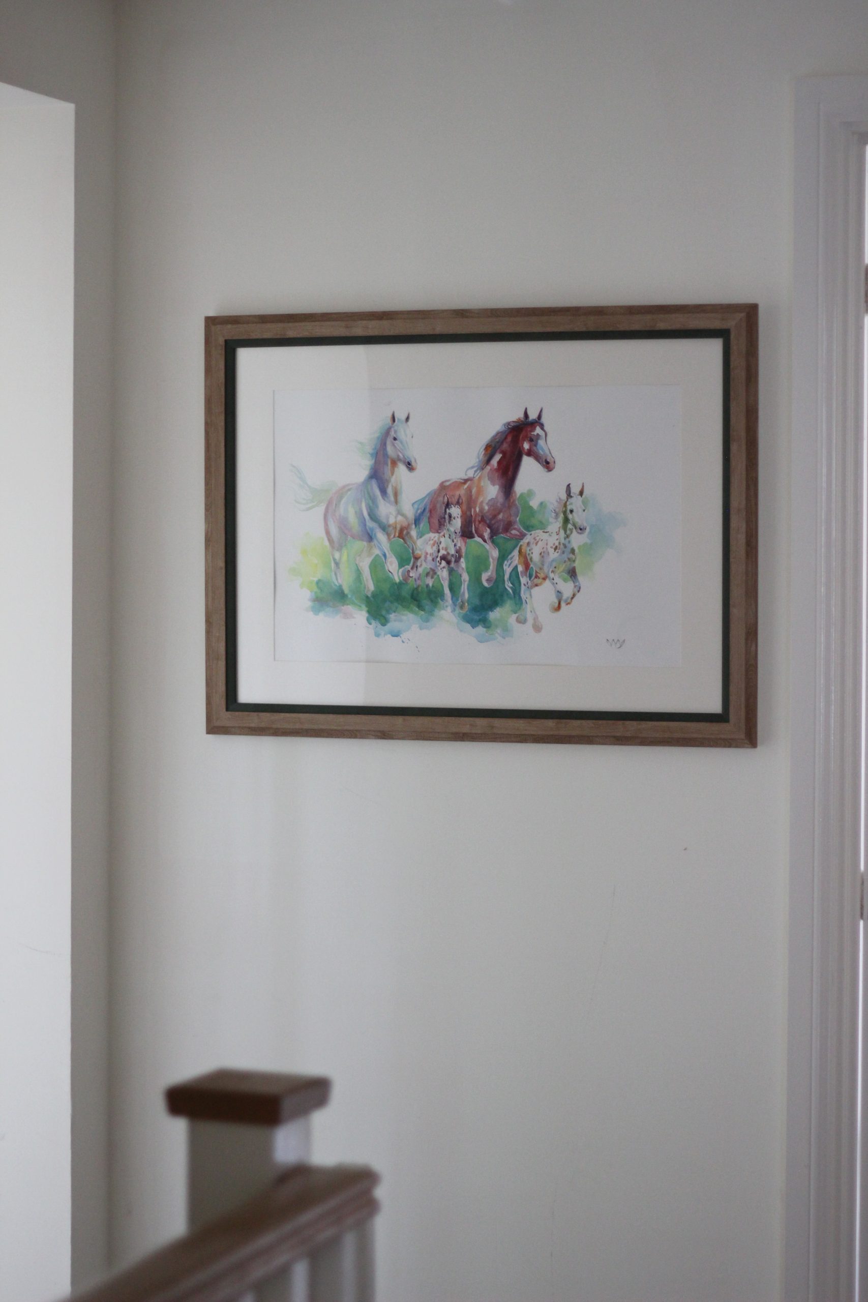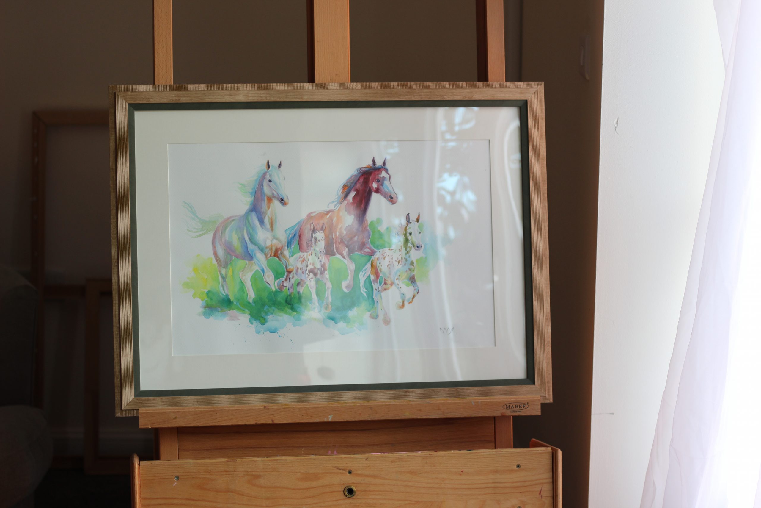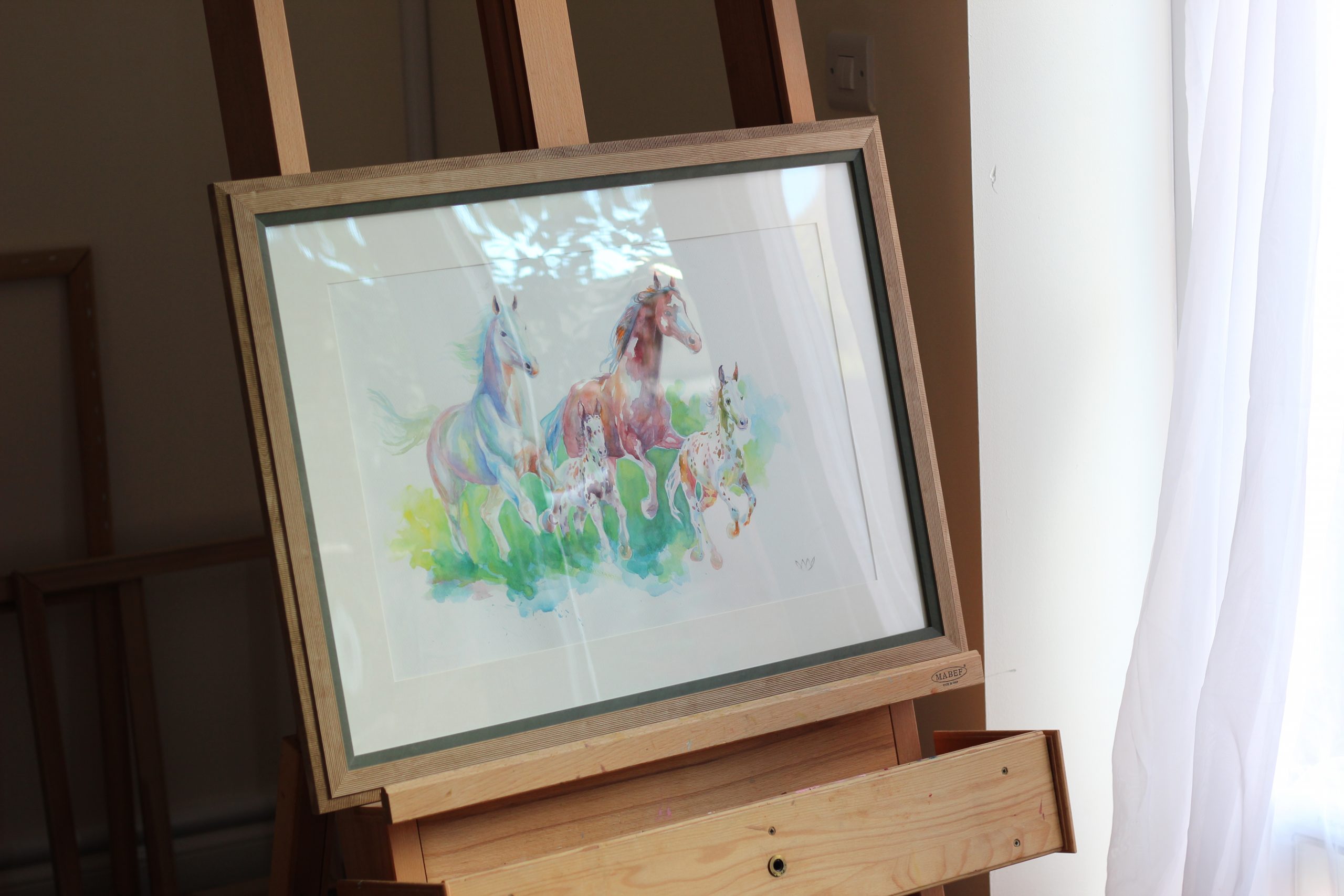 This watercolour herd races forward in a swirl of colour and energy—two playful foals and two graceful adults painted in soft, expressive hues. A beautiful statement piece for any equestrian home, children’s room, or art lover’s collection.